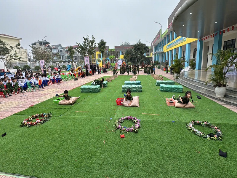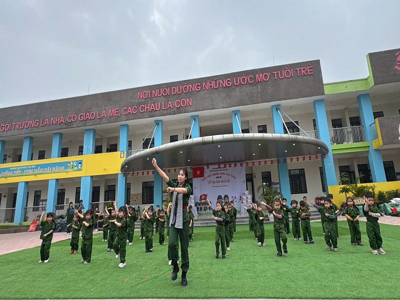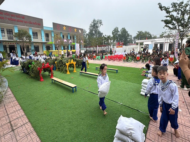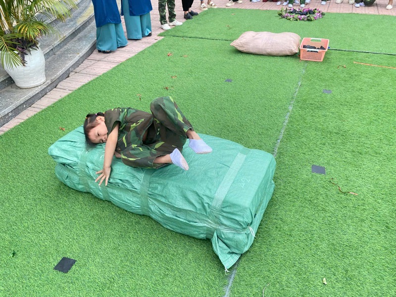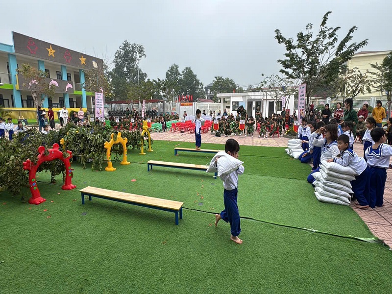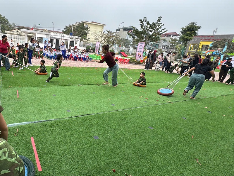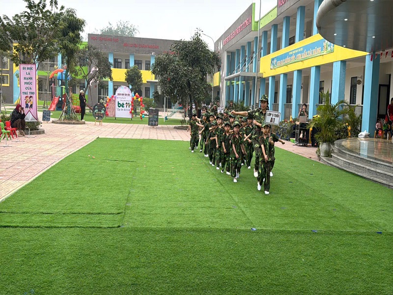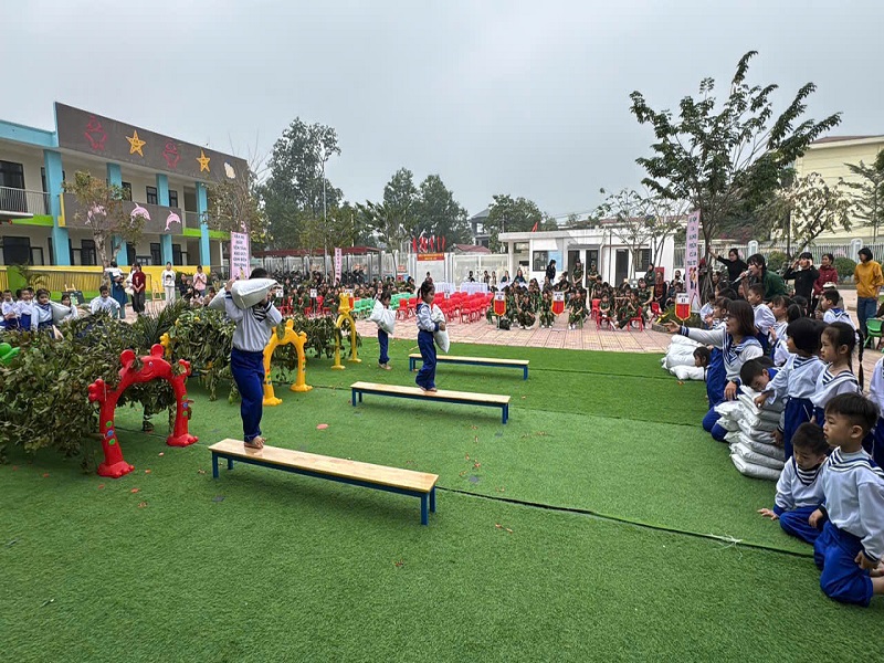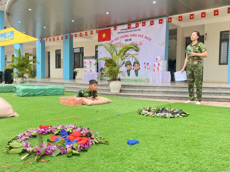Khoác trên mình bộ trang phục chú bộ đội đáng yêu, các con hào hứng tham gia nhiều hoạt động vận động, trò chơi vui nhộn, thể hiện sự nhanh nhẹn, khỏe khoắn và tinh thần đoàn kết.